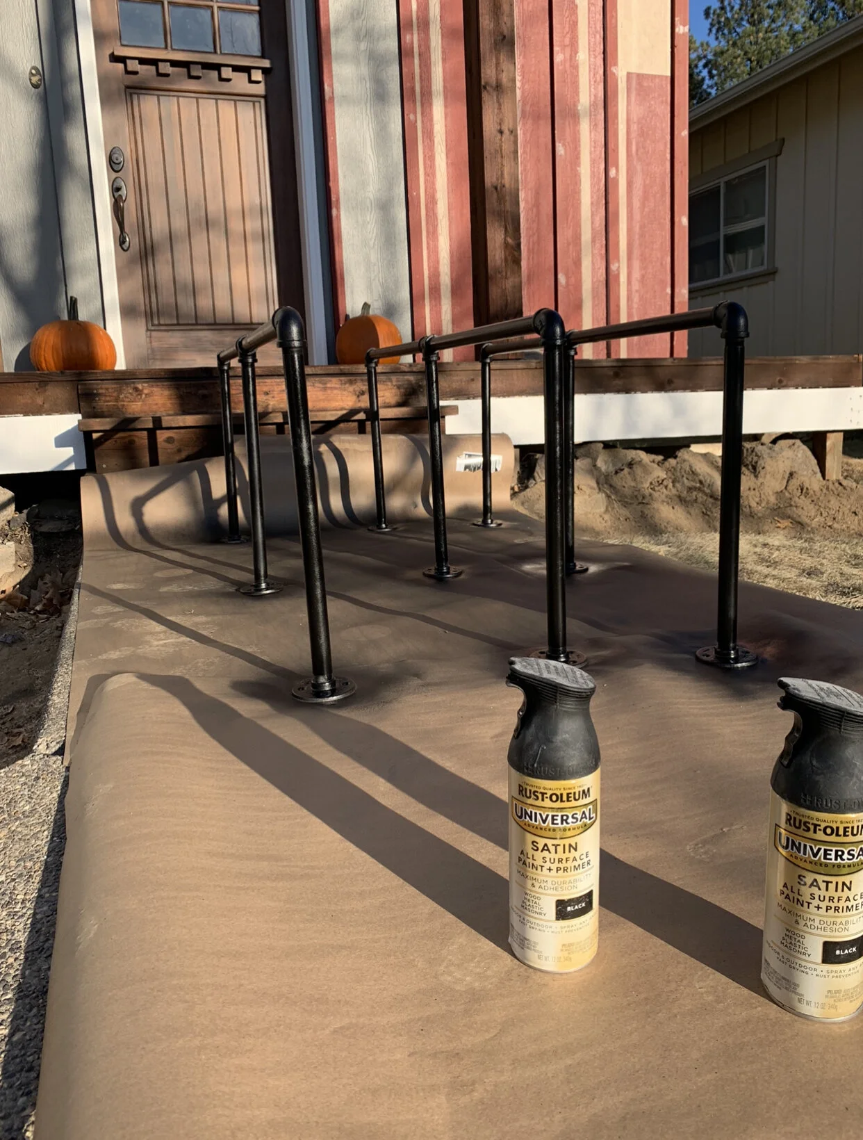 The only picture I have of us installing was in the last house. Here’s my dorky husband checking the strength of the pipe, LOL. He screwed them directly into a stud. They are bomber.
